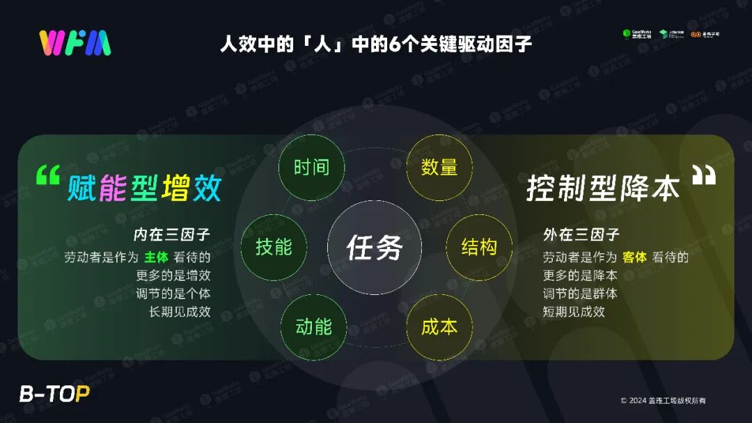 左边的三个因子是从赋能的角度出发的,每个人来到公司,投入他的时间、技能和动能,你用得好不好,能不能人尽其才,把他们的时间发挥到更高效率,而且是要在员工不累前提下考虑这个事情。