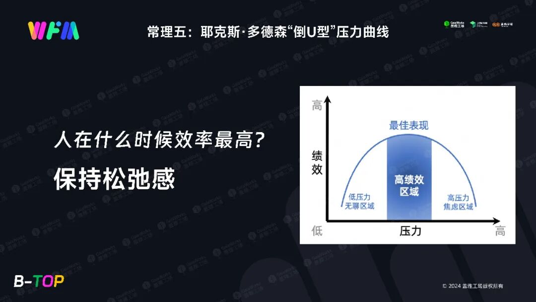 简单来说就是压力与工作表现之间的关系并不是线性的,而是呈现出一种倒U型。适度的压力可以提高工作效率和表现,但过高或过低的压力都可能导致工作效率的下降。尤其对于那些困难的、复杂的工作,压力更是相对偏低的。