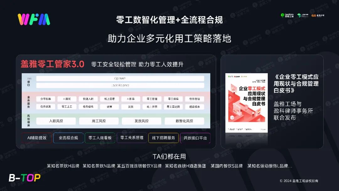 在人和任务匹配的过程中,如果还有差三四个小时的任务时就可以用零工补上去,当然零工要做好零工的合规保障,基于我们客户的实践经验和面临的调整,盖雅工场联合盈科律师事务所共同发起了《企业零工模式运用现状与合规管理》的研究项目,对常见的零工法律问题提出了针对性的法律解答,并辅以企业真实案例,供大家参考 。