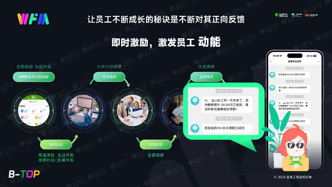 例如盖雅钱包功能,销售佣金实时量化展示都能让员工及时感受到自己因为哪些行为而收到了奖励。例如餐补、高温、全勤类似这样的科目都可以把它变成即时激励,让员工不停地得到“好消息”。