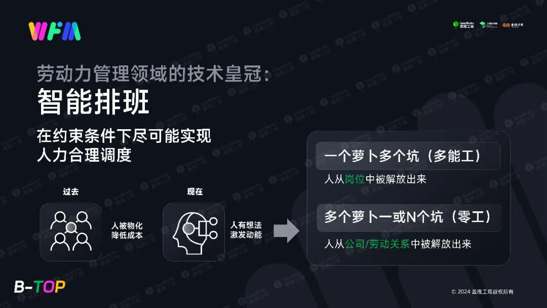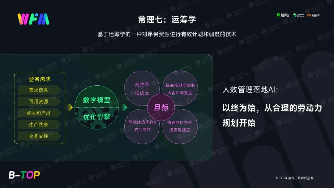 在人效领域,AI的价值也值得挖掘,尤其对于劳动密集型的行业企业来讲,不管人也好,还是物品也好,还是资源也好,在做大量资源优化的调度。公司里面存在浪费,浪费是因为没有合理的利用,这个时候我们可以借用AI算法能力,帮我们用合适的人在合适的时间从事合适的岗位,拿到合适的报酬。这就是基于运筹学的AI技术运用。