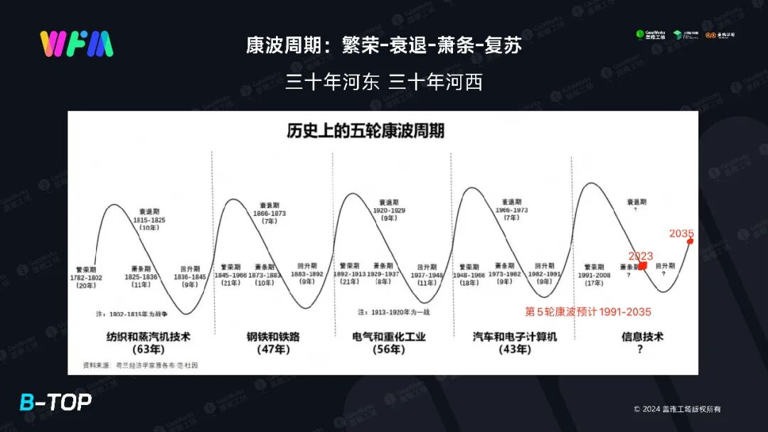 康波周期大概五六十年一个周期,与中国人说的“三十年河东,三十年河西”不谋而合,同样是60年一个周期。只是西方讲得更加逻辑化,我们讲得更加意会。