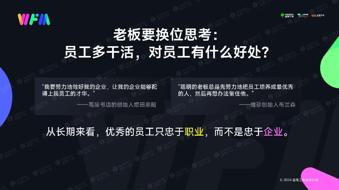 但员工永远不会忠诚于企业,也不会忠诚于个人。从长期来讲,优秀的员工只忠于他个人的职业。所以老板和企业要做的事情让他在你这家公司能发挥好他的职业。