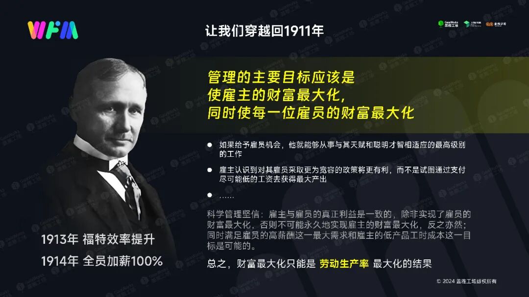 例如一百多年前的泰勒,大家一听泰勒,这就是公司剥削员工的鼻祖,这是最大的误解。如果你翻开他的《科学管理原理》,会发现第一句话是这样写的:管理的主要目标应该使雇主的财富最大化,同时使每一位雇员的财富最大化。