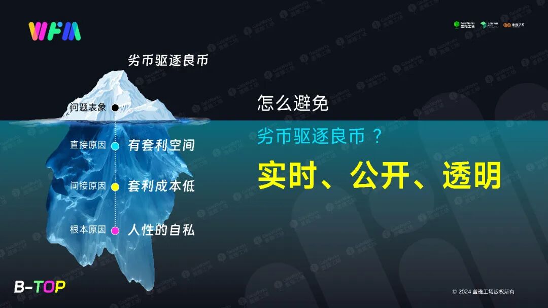 所以解决劣币驱逐良币的方法也很简单,就是把大量的数据实时、公开、透明结束,公开透明是取得信任最简单的方案,彼此公开会让彼此的信任程度大大增加,就不会产生猫腻。