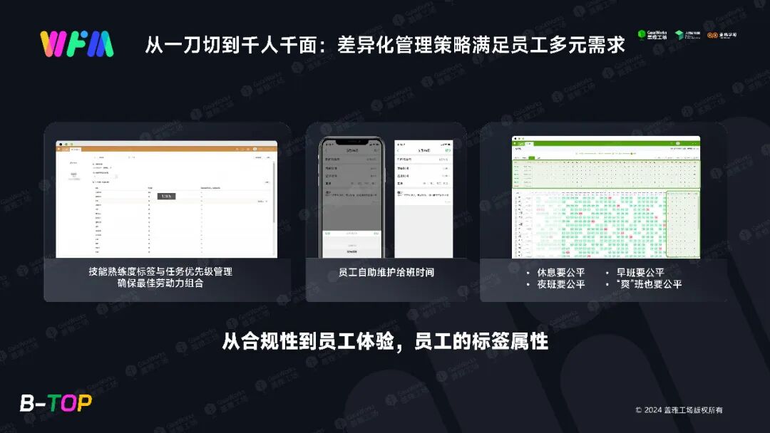 我们在管理做服务,做数字化落地的时候,就希望把员工每个人的标签属性、技能、爱好、情绪能够把他数字化,让每个人能够享受多元化上班的需求。例如知道某位员工愿意多干,承压能力强就可以多安排(合规前提下),年纪大可以让他尽量上早班,年轻人尽量别让他上早班,他们喜欢晚上工作。
