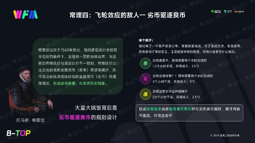 飞轮效应也是有敌人的,我认为劣币驱逐良币是飞轮效益最大的敌人,这也是我们管理者制定规则时最大的误区。举了一个非常简单的案例,我们细想自己的规则是不是这么设计的?