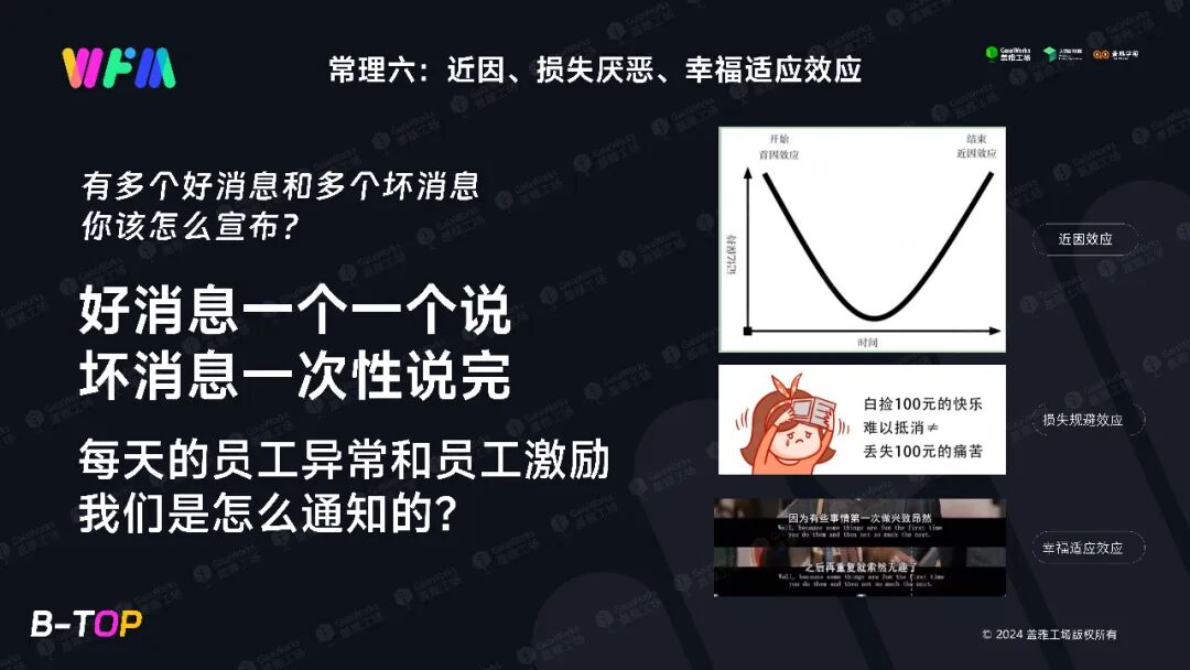 刚才提到激励的状况,每个人对事物的感觉都不一样,比如近因、损失厌恶、幸福适应效应。比如有多个消息,怎么向老板汇报,让对方心里爽一点?答案就是好消息是一个一个说,坏消息一次性说完。这个大家都懂,也是常理。