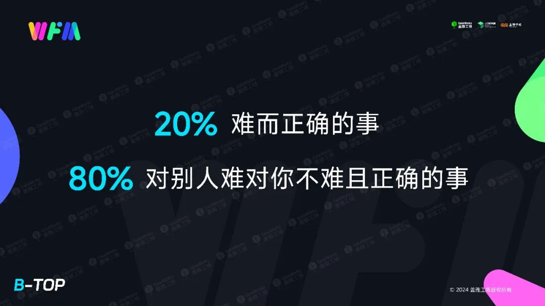 过去我们说要做难而正确的事,我的观点略有不同,我们应该去做对别人很难,但对你不难且正确的事。至少要花80%的精力在后者,不要把80%的精力成本投在难而正确的事情上。这时你的方向正确、你的战略政策和人效才会大大提升。