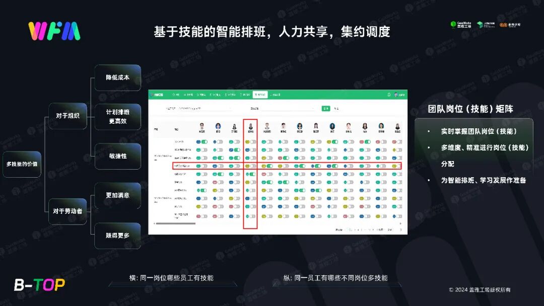 其次,同时社会结构的变化让零工逐渐兴起,劳动关系变化,发现多个萝卜可以到一个坑。在这个过程中,假设你们公司每个人有5种技能,每种技能高中低不等,如何用AI的方式把技能和任务连接起来。